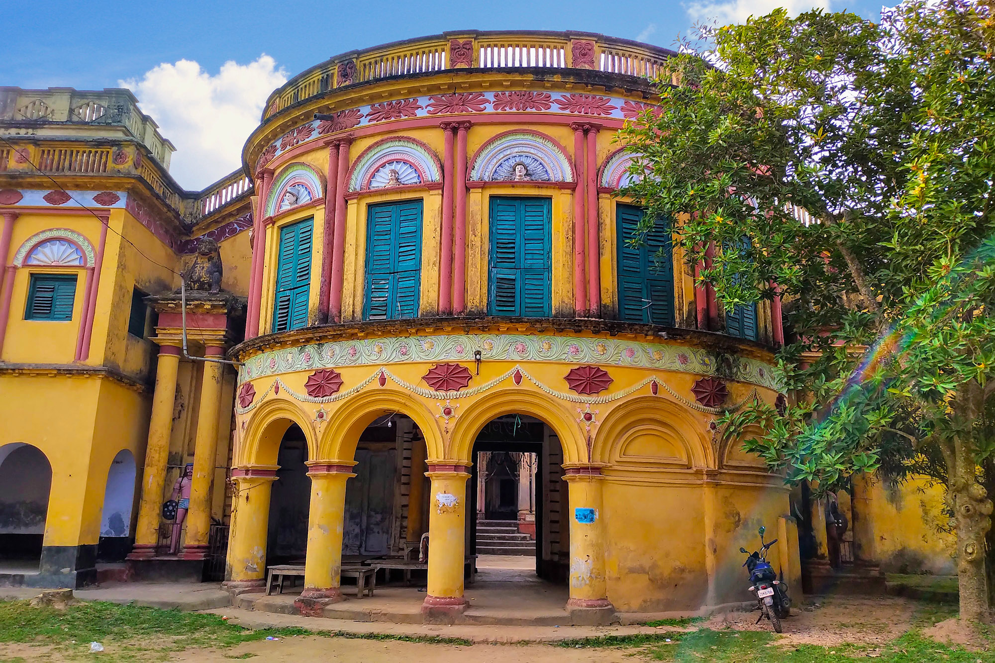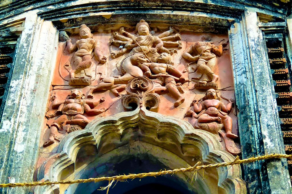 The rasmancha of Baro-taraf of Mondal family of Hadal Narayanpur is simply unique in many respects. First of all it is one of the largest of its kind – double storied with a height of about 40 feet. Secondly, all the sides are decorated with rich terracotta works. Thirdly, it may seem from a distance that this tall structure looks like a temple. Fourthly, each corner of the rasmancha has sculptures depicting Gaja Lakshmi; Ram Sita; Krishna Radhika; Anantasayan Bishnu; Gostho-Lila; Mahisasuramardini Durga; Marriage of Shiva; Shiva Nandi-Bhringi.