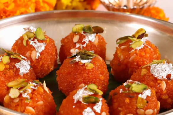 Moti Choor Ladoo: Round in shape, made of besan (gram four) and consisting of cardamom, pistachio and a touch of saffron.